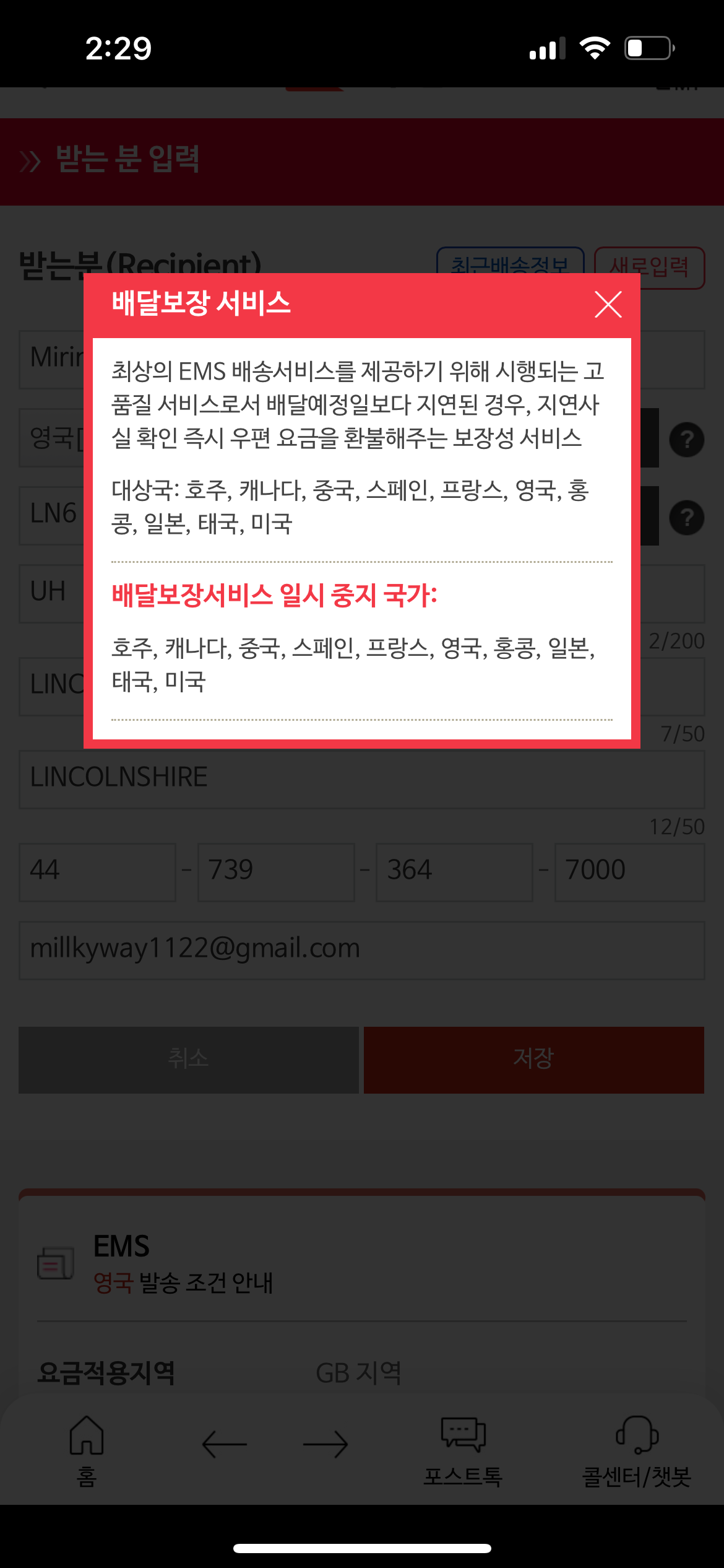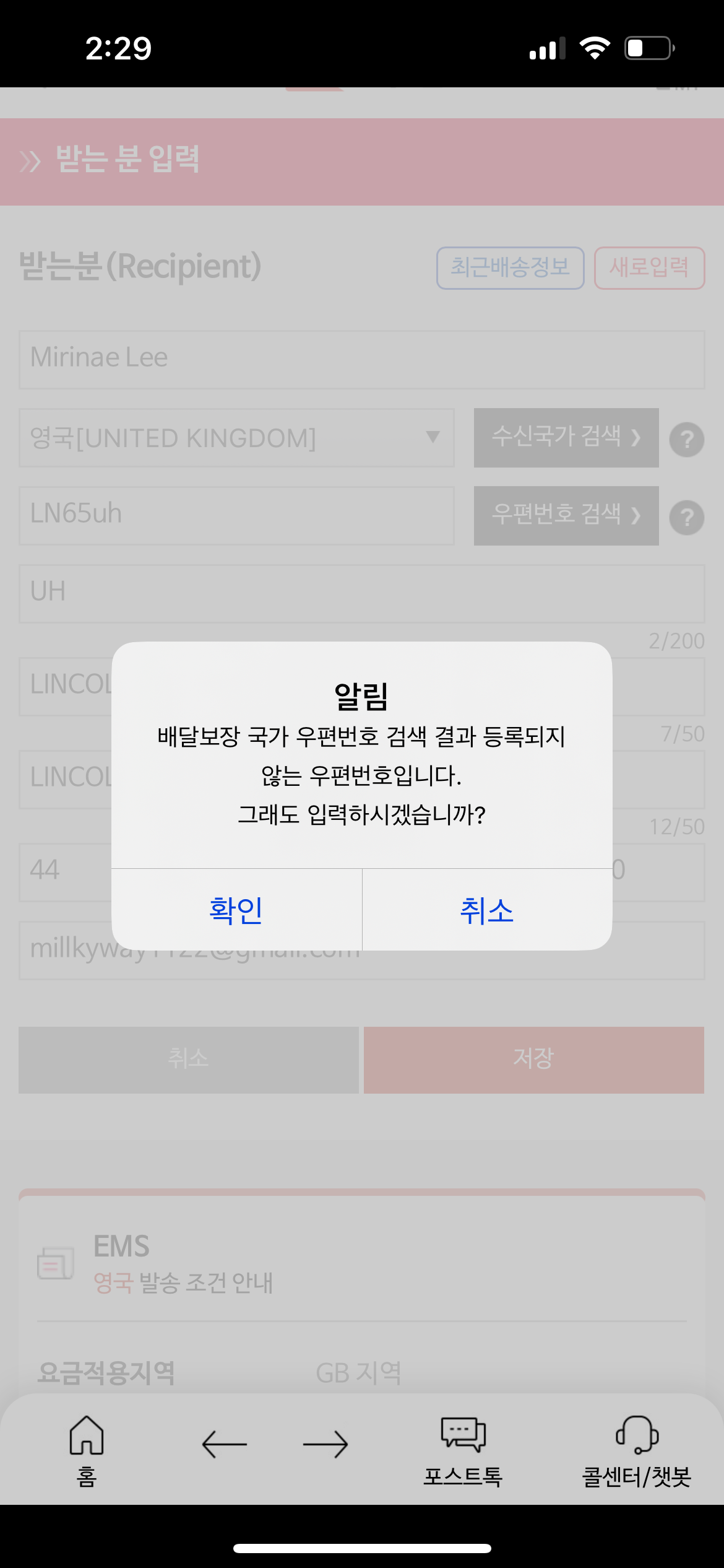 EMS 스마트폰앱을 통해 접수를 했을 때, 영국 동생네 Postcode 가 LN6 5UH 인데,