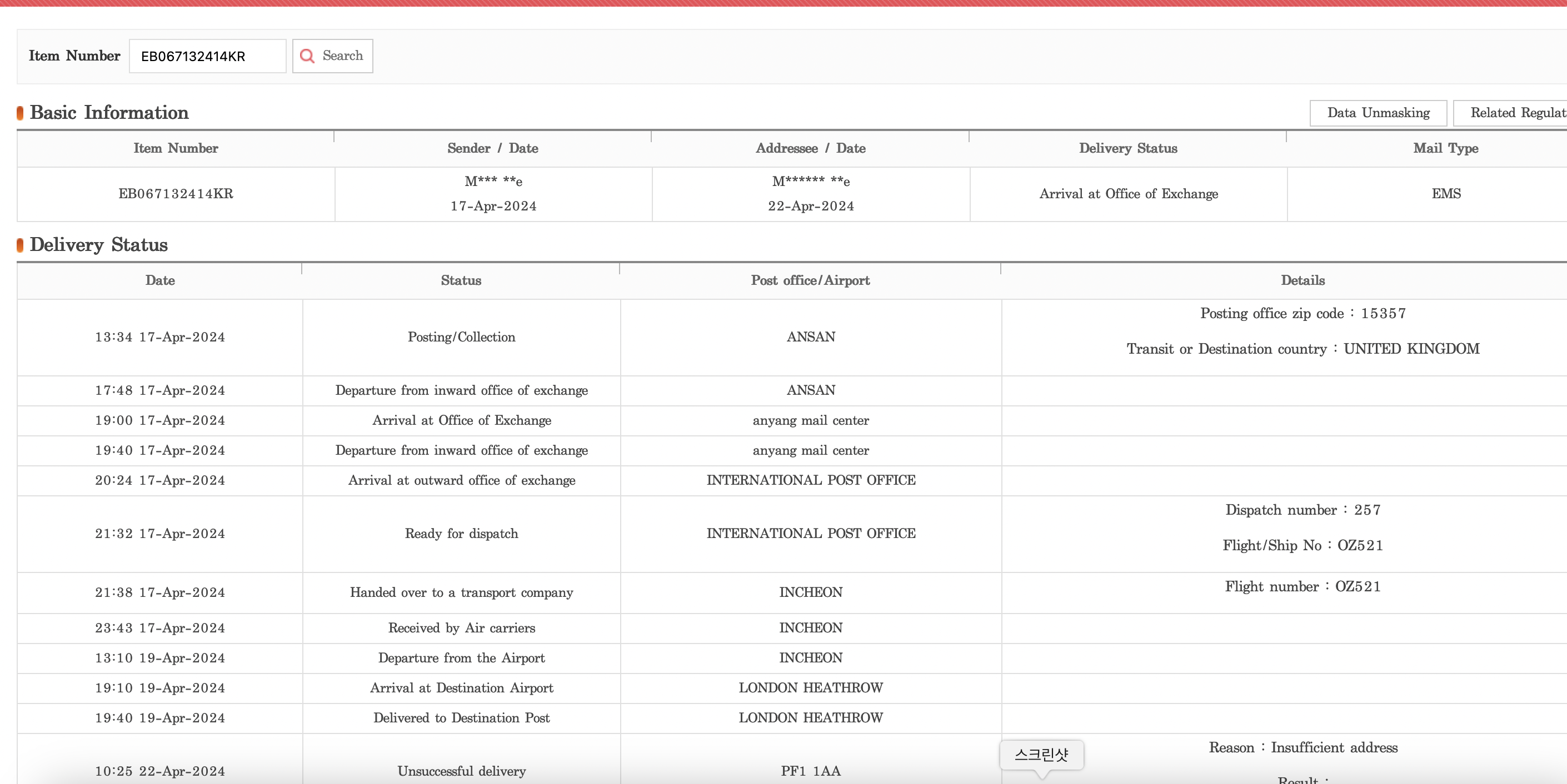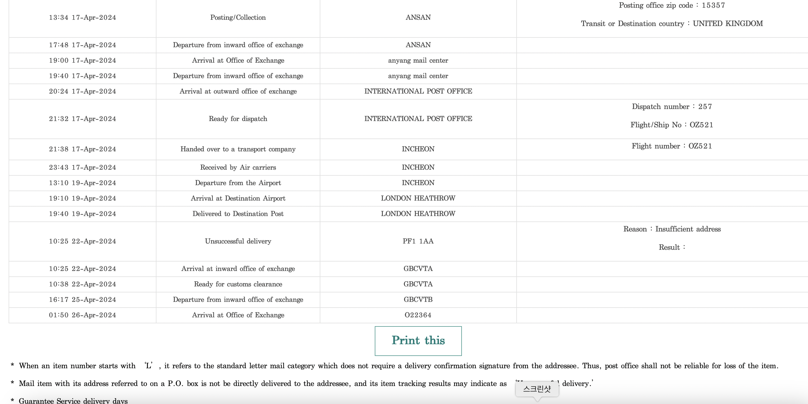 세번째 문제는 앞서 말했듯이 영국과 한국은 정식으로 물품에 대해 주소 수정을 요청할 시스템 계약이 없다는 점이다.